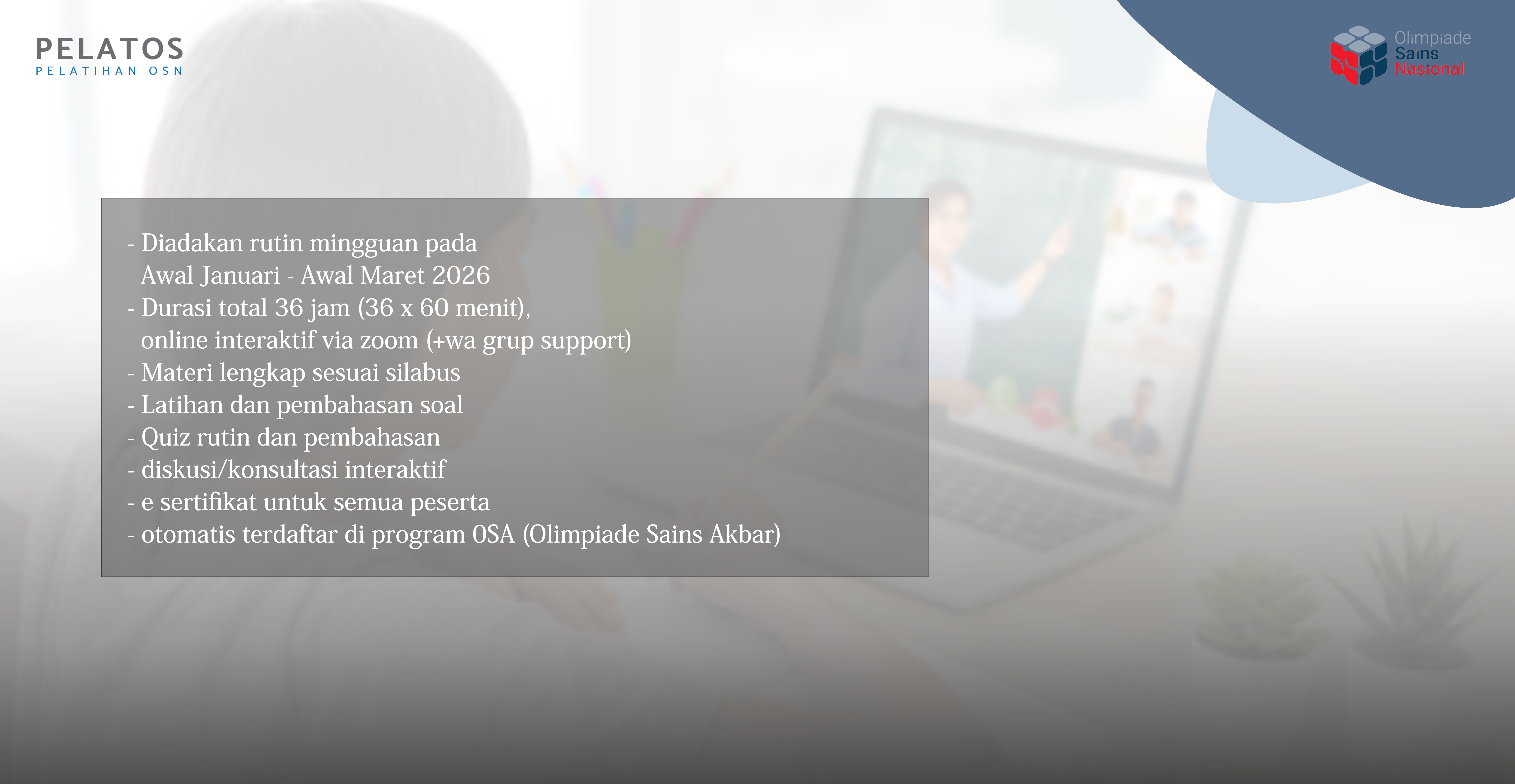Dalam rangka persiapan menghadapi Olimpiade Sains Nasional tingkat Kota (OSN-K) 2026, kami membuka program Pelatihan Rutin Online Persiapan OSN-K 2026 tingkat SD, SMP dan SMA (level medium), berupa pembelajaran online interaktif rutin dan terjadwal yang dilakukan melalui aplikasi zoom. Peserta pelatihan ini juga akan otomatis terdaftar pada program Olimpiade Sains Akbar (OSA), yang dapat digunakan sebagai ajang uji coba kemampuan siswa sebelum OSN-K diadakan. Pada pelatihan ini akan diberikan materi-materi sesuai silabus OSN-K, pembahasan soal-soal, quiz evaluasi serta diskusi dan konsultasi dengan tim tentor berpengalaman.