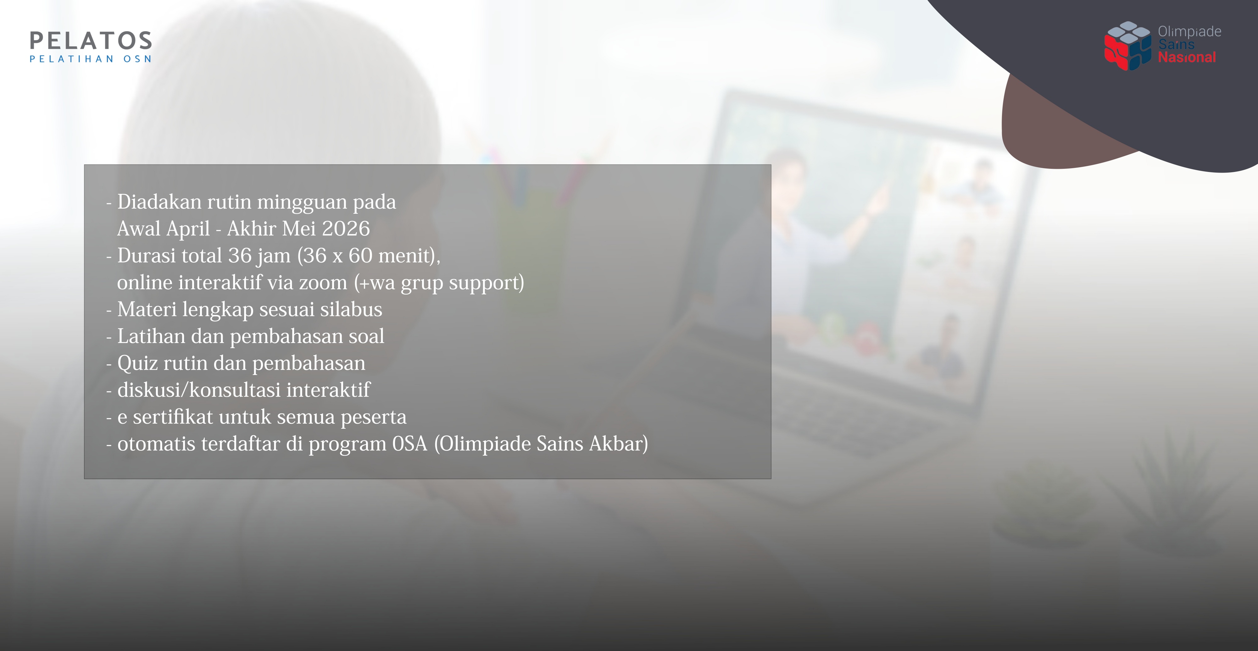 Dalam rangka persiapan menghadapi Olimpiade Sains Nasional tingkat Kota (OSN-K) 2026, kami membuka program Pelatihan Rutin Online Persiapan OSN-K 2026 tingkat SD, SMP dan SMA (level medium), berupa pembelajaran online interaktif rutin dan terjadwal yang dilakukan melalui aplikasi zoom. Peserta pelatihan ini juga akan otomatis terdaftar pada program Olimpiade Sains Akbar (OSA), yang dapat digunakan sebagai ajang uji coba kemampuan siswa sebelum OSN-K diadakan. Pada pelatihan ini akan diberikan materi-materi sesuai silabus OSN-K, pembahasan soal-soal, quiz evaluasi serta diskusi dan konsultasi dengan tim tentor berpengalaman.