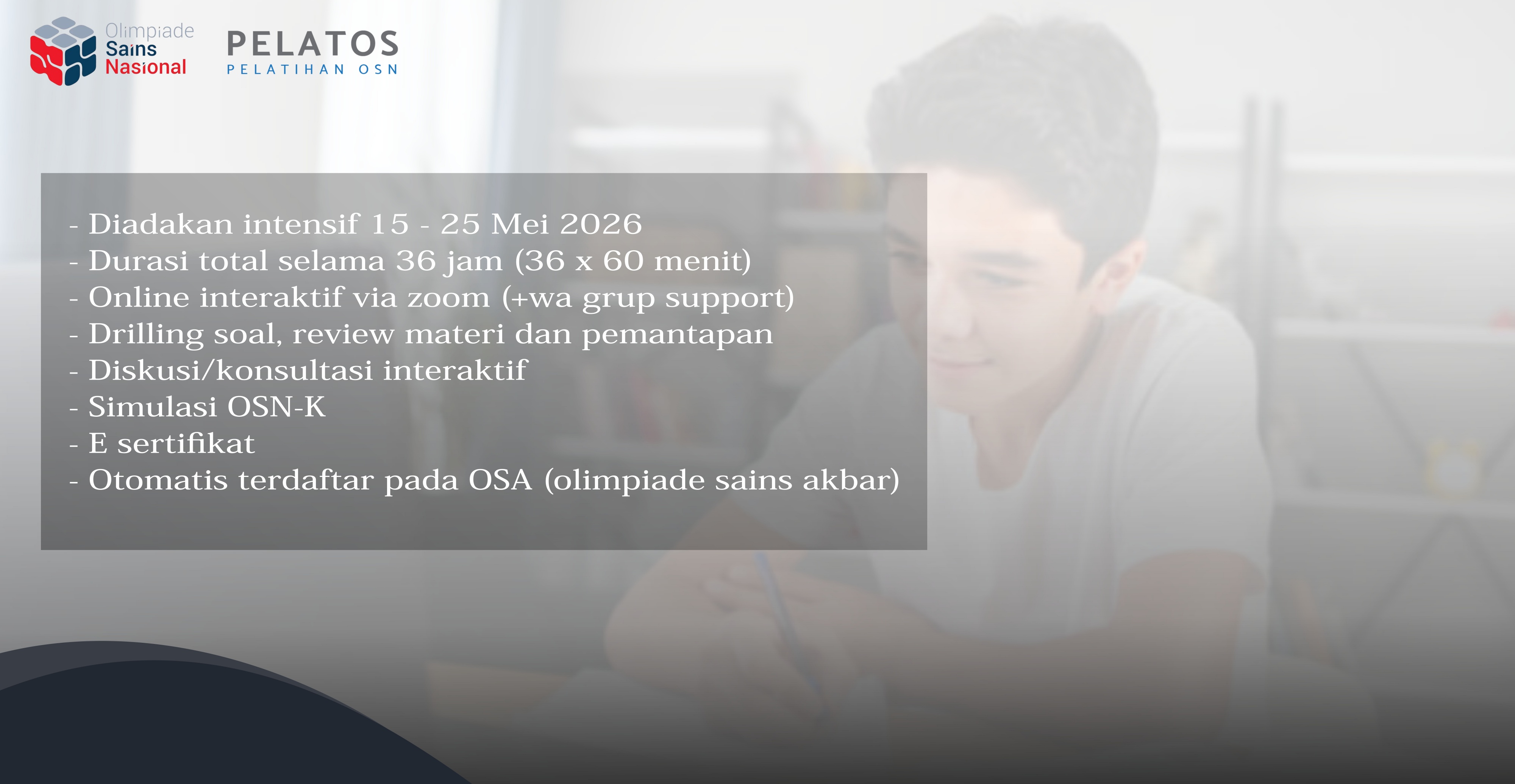 Halo Sobat Sains, Telah dibuka Pelatihan Akbar Online OSN-K 2026 tingkat SMA (kelas pagi), yang akan diadakan pada tanggal 15 - 25 Mei 2026, pelatihan ini berupa pembelajaran online interaktif intensif dan terjadwal yang dilakukan melalui aplikasi Zoom. Pelatihan ini bertujuan untuk mempermantap persiapan sehingga siswa lebih siap untuk menang di OSN-K dan lolos ke OSN-P dan OSN tahun 2026.